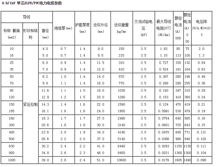 1.未作特別說(shuō)明,電纜額定電壓(Uo/U)均為0.6/lkV銅導(dǎo)體單芯低壓電力電纜。